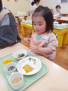 “わぁ~!ご飯が鬼さんのお顔になってる~!”